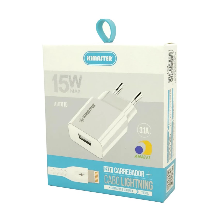 Kit carregador turbo de tomada da marca Kimaster, T503UL, compatível com o padrão Brasileiro e Americano de tomada para iPhones