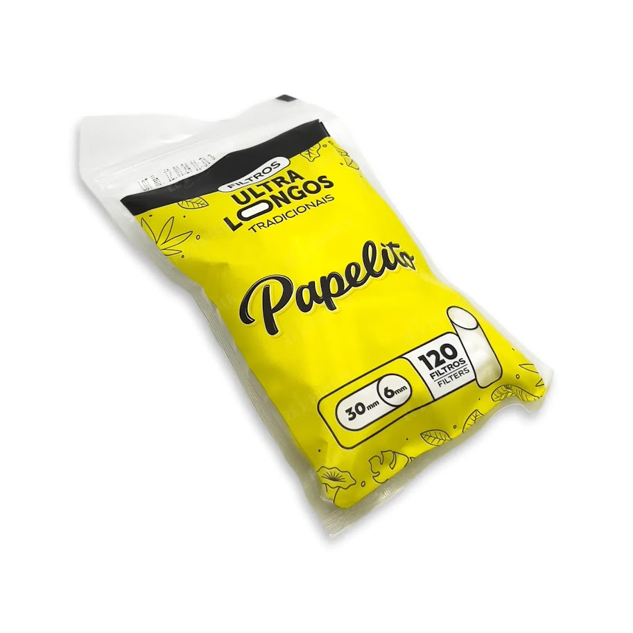 O Filtro Papelito Ultra Longo é um filtro de acetato para cigarros artesanais ou de tabaco, que se destaca pelo seu tamanho ultra longo (30mm), superior ao dos filtros tradicionais, e tem um diâmetro de 6mm. Ele foi projetado para oferecer maior conforto, reduzir os danos à saúde através de uma filtragem mais eficiente de alcatrão e nicotina, e manter o sabor do tabaco. O produto vem em pacotes com 120 unidades e sua embalagem é geralmente uma bolsa plástica com fecho tipo zip lock, proporcionando praticidade.